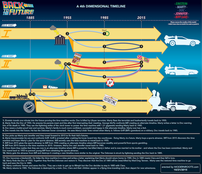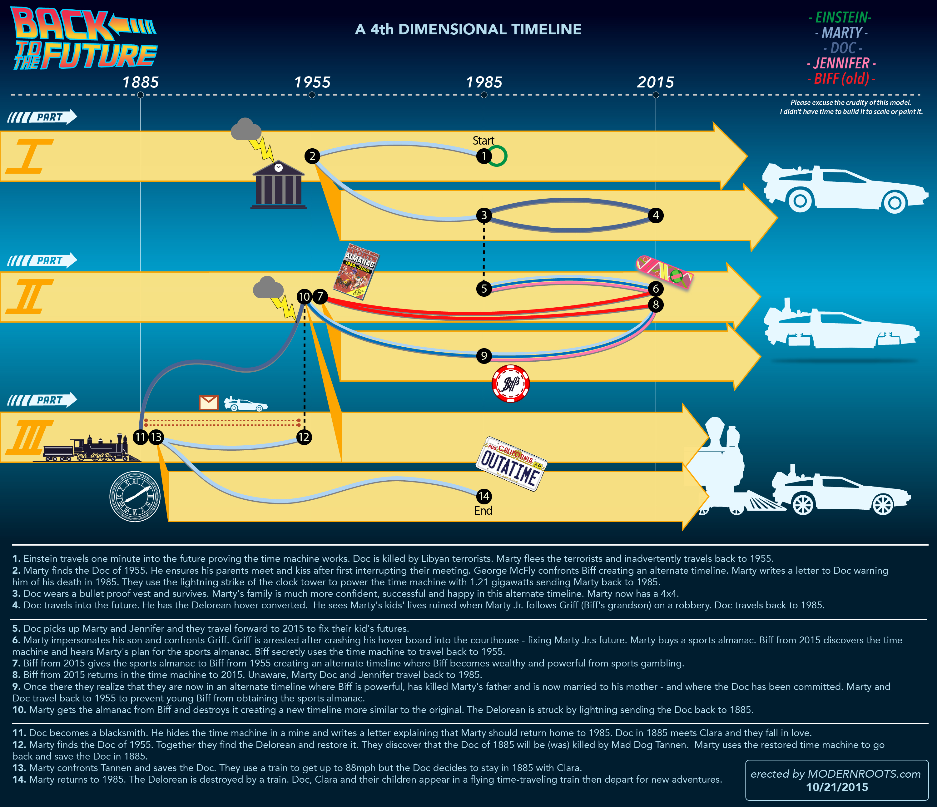 To Celebrate the arrival of DOC and MARTY from the year 1985 at 7:28 AM on Oct 21st 2015 we present a timeline of timelines from the beloved Back to the Future Trilogy - complete with detailed footnotes.