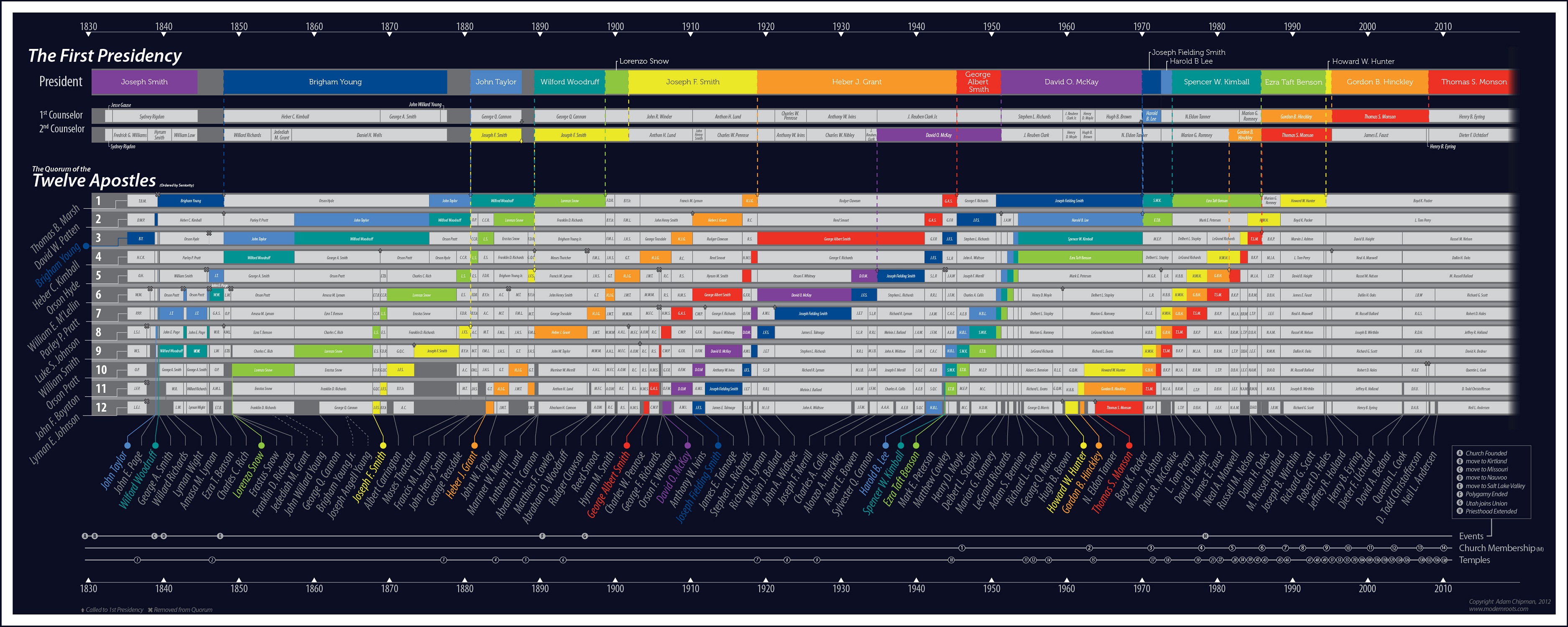 A timeline showing the history of the First Presidency and the Quorum of the Twelve Apostles of the Church of Jesus Christ of Latter-Day Saints. Apostles are shown in order of seniority. Also included for reference are the membership, temple count, and key church history events.