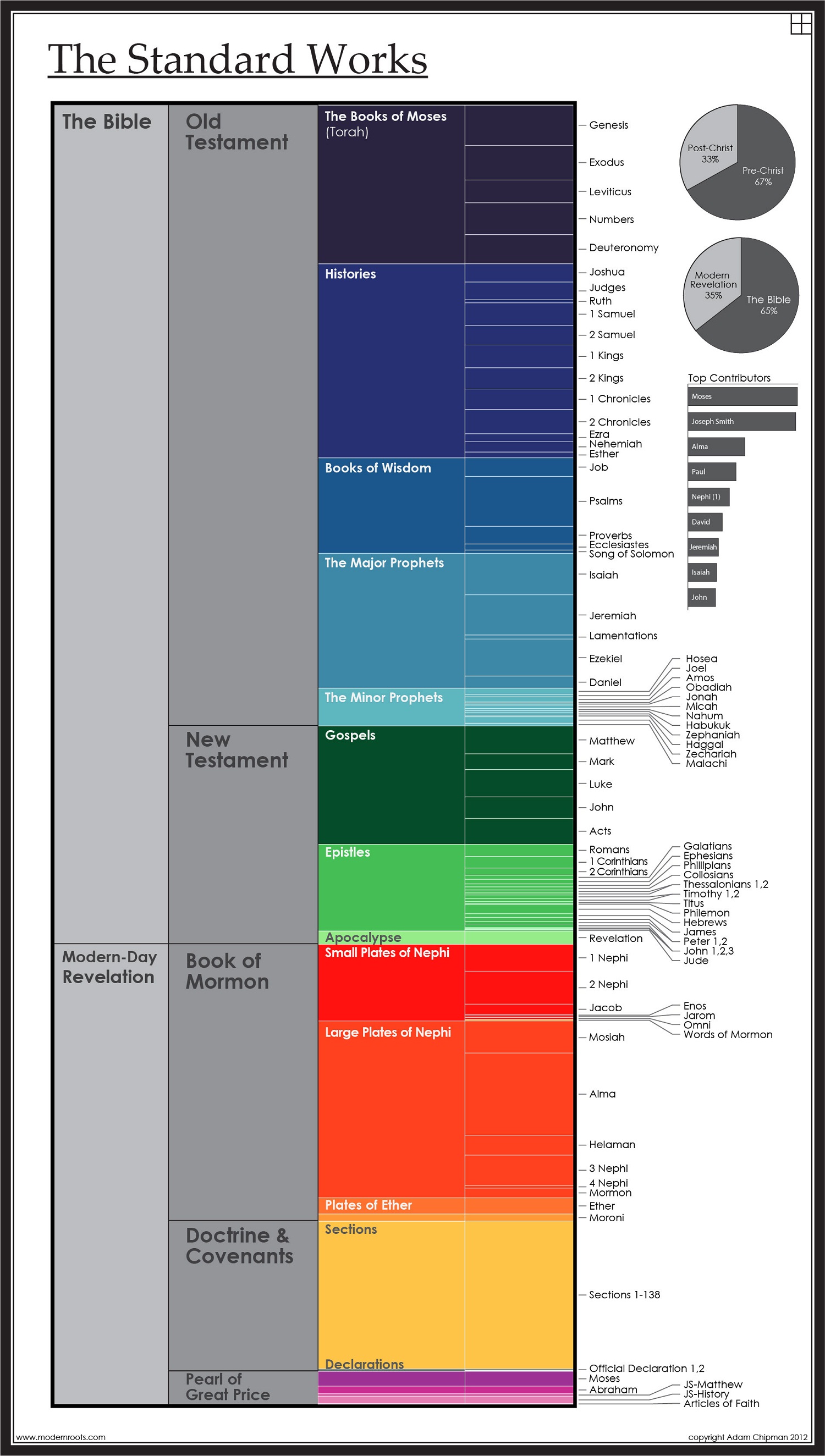The relative size of the books in pages. Also a comparison of Ancient vs. Modern Scriptures and scriptures Before vs. After the coming of Christ AND the top contributors to the cannon.